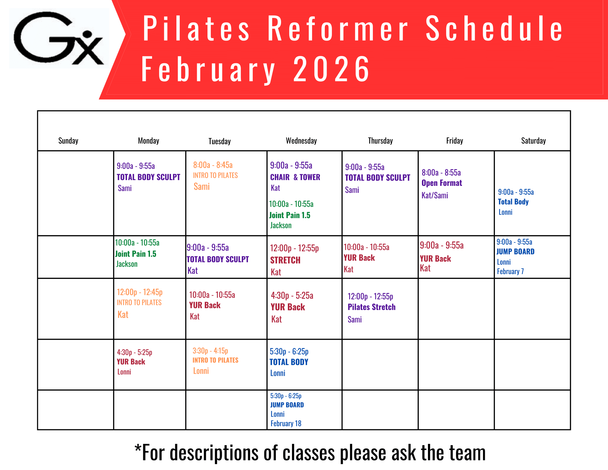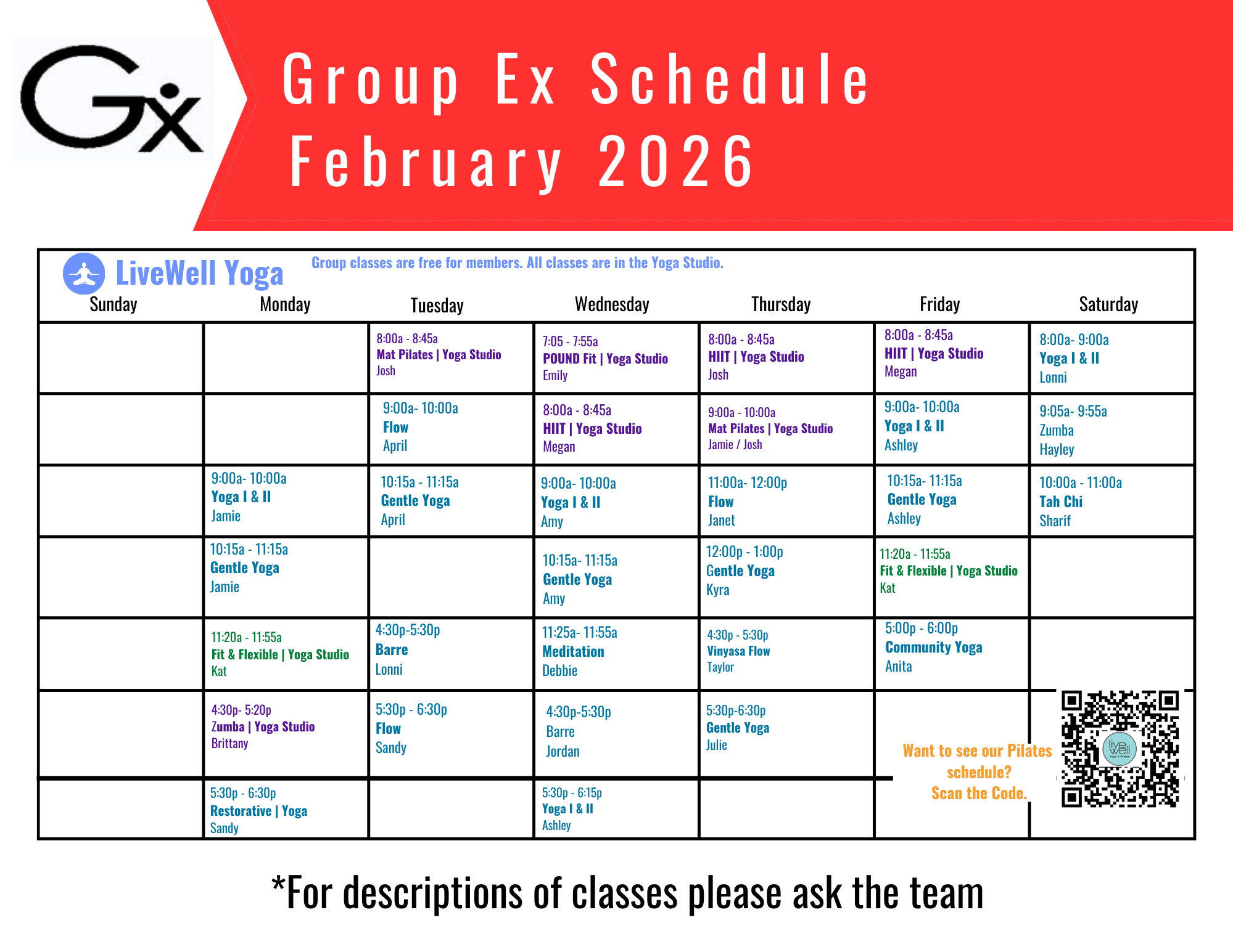 Yoga and Pilates classes. Please see the updated Yoga and Pilates schedule on our website.