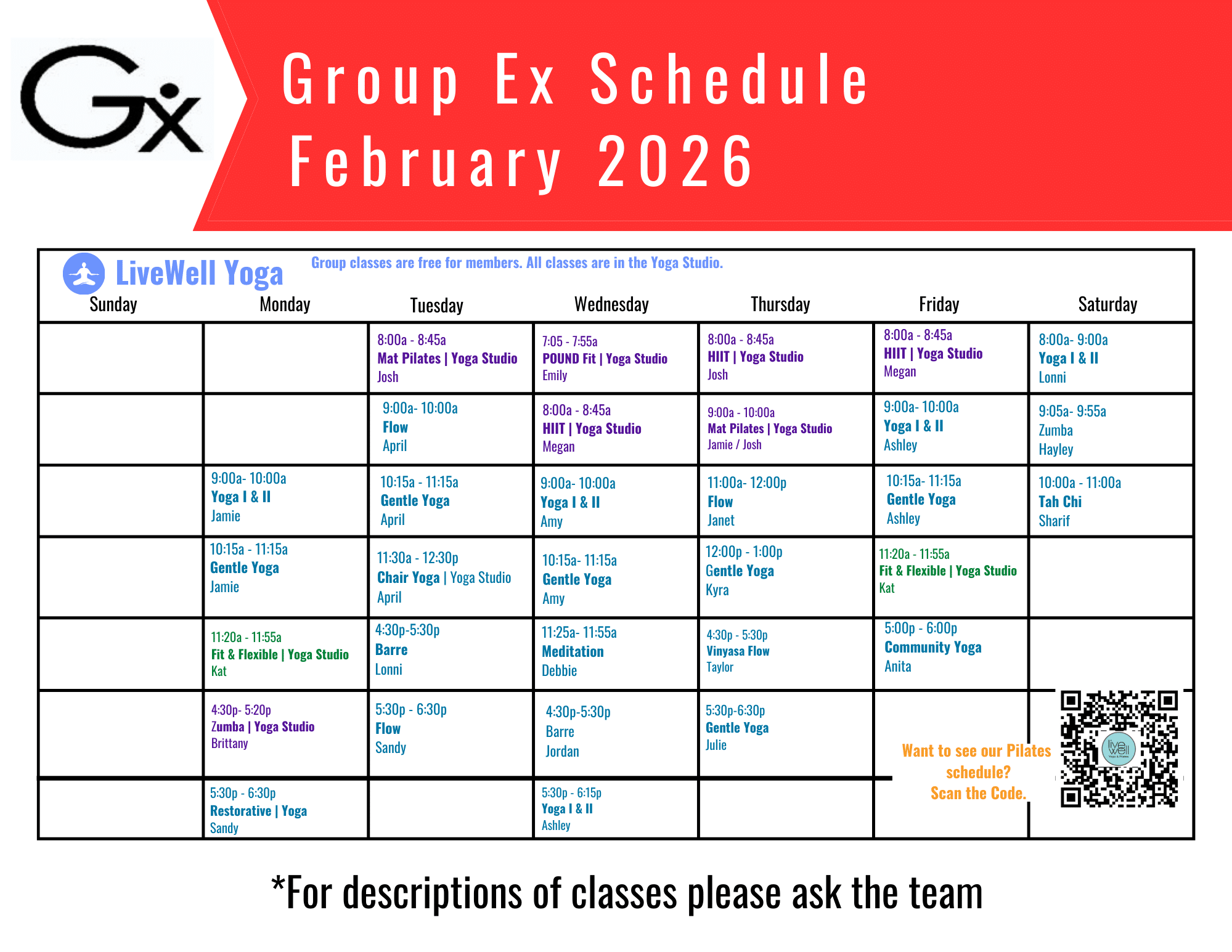 Yoga and Pilates classes. Please see the updated Yoga and Pilates schedule on our website.